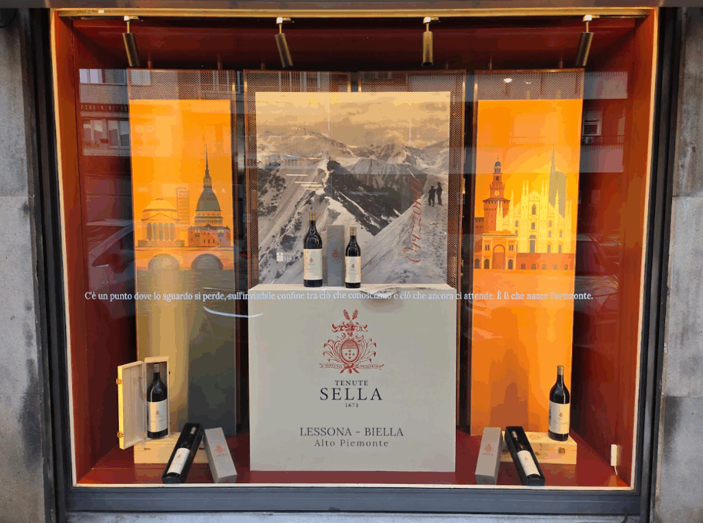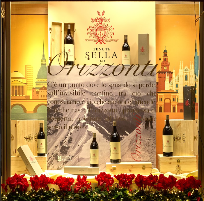 Al centro della scena c’è il concetto di Orizzonte: un invito alla speranza e allo slancio, tradotto visivamente in una vetrina dai colori caldi e naturali. Protagonista assoluta è la bottiglia (in formato standard e Magnum), che celebra l’identità della tenuta di Lessona e l’arte fotografica di Vittorio Sella.